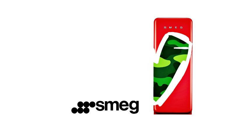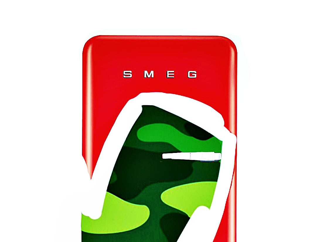 Unique SMEG refrigerator featuring a camo heart motif